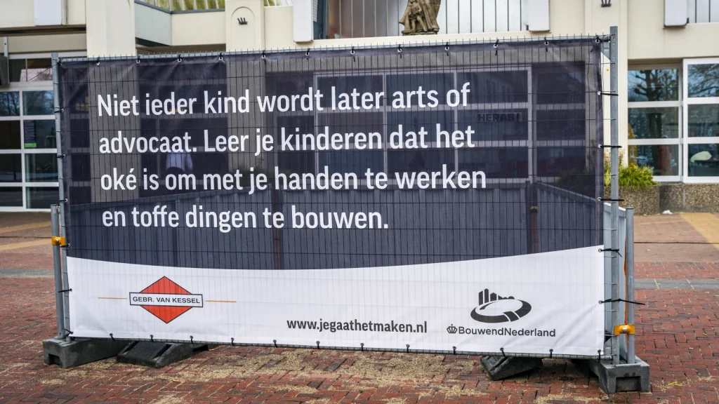 Als je een beetje actief bent op LinkedIn of rond bouwplaatsen, heb je ‘m misschien weleens voorbij zien komen. We doelen op dit doek. ‘Niet ieder kind wordt later arts of advocaat. Leer je kinderen dat het oké is om met je handen te werken en toffe dingen te bouwen’, staat erop.