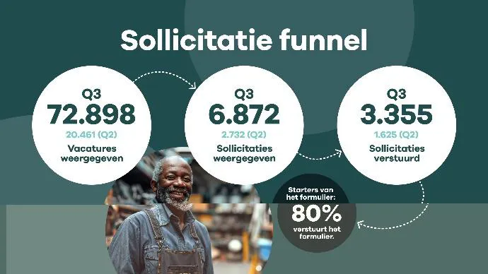 Dat is nog niet alles. In het derde kwartaal van 2025 hebben ruim 3.600 bezoekers daadwerkelijk gesolliciteerd op een leerbaan. Als deze trend zich doorzet, resulteert dit in ruim 14.000 sollicitaties per jaar. Als we uitgaan van een success rate van 3% (soortgelijke portalen hebben een success rate tussen de 2%-5%), betekent dit dat Leerbanenmarkt de potentie heeft om jaarlijks 420 bezoekers aan een leerbaan te helpen. Daarvan is ca. 50% een werkzoekende.